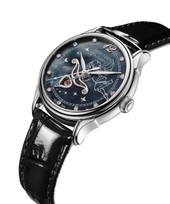黑色 MOP 表盤,帶鉆石標(biāo)記。顯示時(shí)、分、秒。這款奢華腕表的表盤 12 點(diǎn)鐘位置印有品牌標(biāo)識(shí)。