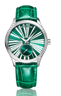 綠色表盤,帶羅馬數(shù)字鉆石標記。顯示小時、分鐘和秒。這款奢華腕表的表盤 12 點鐘位置印有品牌標識。