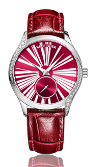 紅色表盤搭配羅馬數(shù)字鉆石標(biāo)記。時(shí)、分、秒顯示。這款奢華腕表的表盤 12 點(diǎn)鐘位置印有品牌標(biāo)識(shí)。