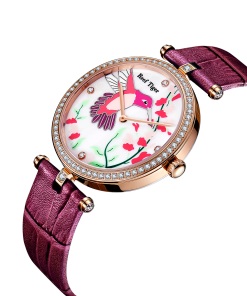 白色 MOP 表盤,帶鳥和花圖案。鉆石標記,小時和分鐘顯示。這款時尚的女士手表表盤上有花朵圖案,10 點鐘位置有一只小鳥。