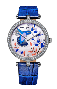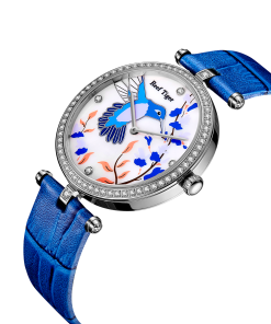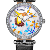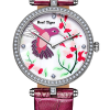 白色 MOP 表盤,帶有鳥和花圖案。鉆石標記,小時和分鐘顯示。這款時尚的女士手表表盤上有花朵圖案。