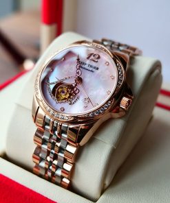 表盤(pán)上鑲有鉆石標(biāo)記。顯示時(shí)、分、秒。這款奢華腕表的表盤(pán) 12 點(diǎn)鐘位置印有品牌標(biāo)識(shí)。