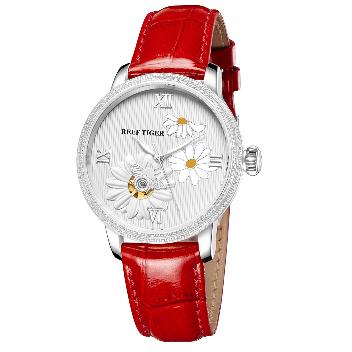 Reef Tiger Love Bee 腕表。耐用的鋼質(zhì)鉆石表圈也適合打造專業(yè)的提案和演示。耐用的聚酯前后蓋與協(xié)調(diào)。