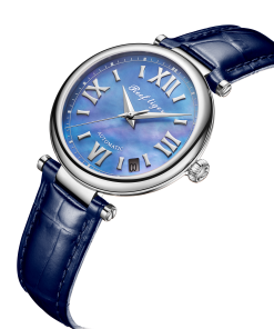 藍(lán)色表盤,帶羅馬時(shí)標(biāo)。時(shí)、分、秒和日期顯示。這款奢華腕表的表盤 12 點(diǎn)鐘位置印有品牌標(biāo)識(shí)。