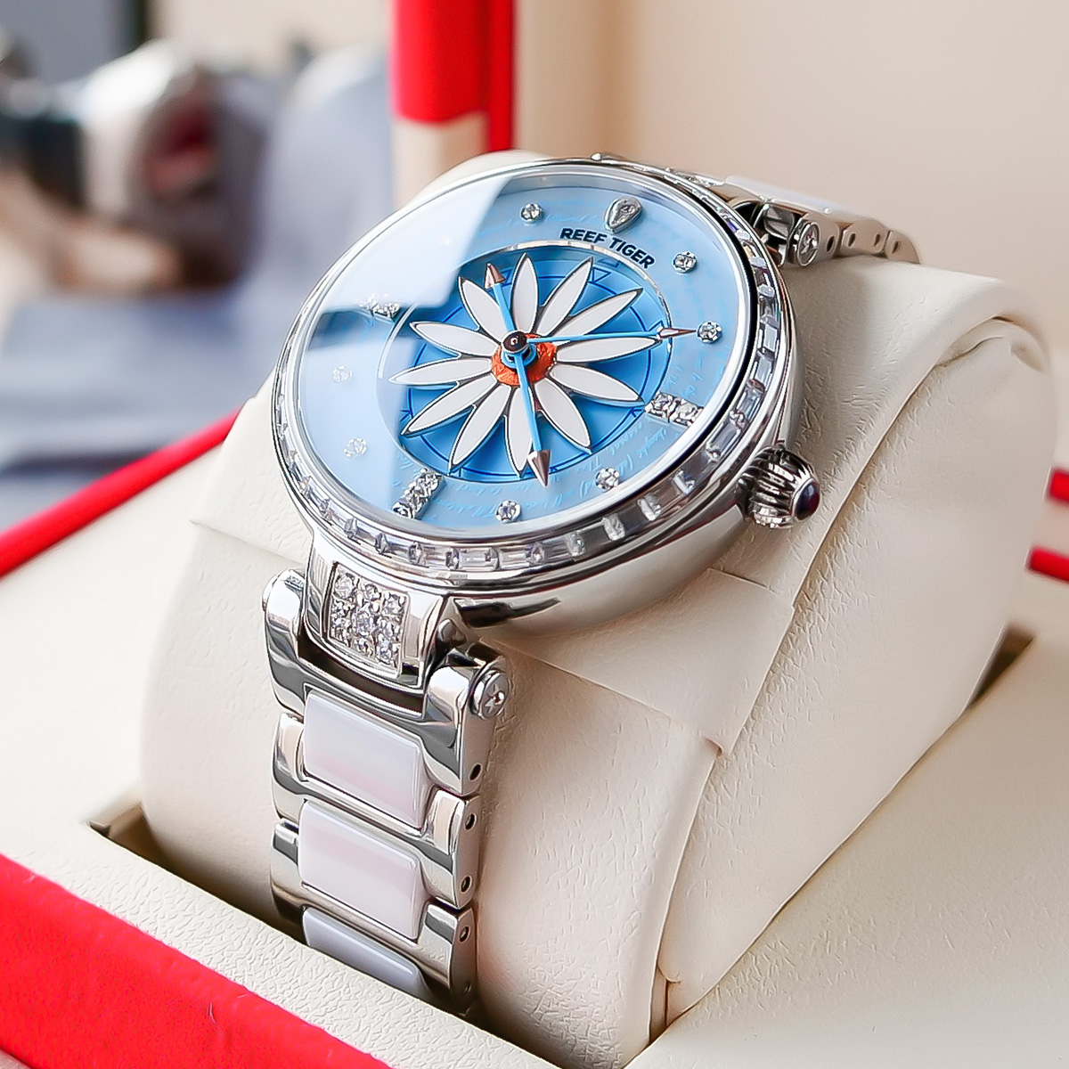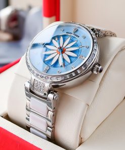 表盤配有鉆石標記。顯示時、分、秒。手表表盤中央有一朵美麗的百合花。