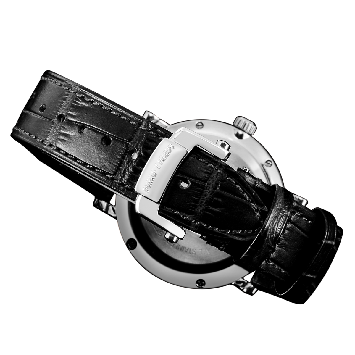 SpidoLite 黑色紋理小牛皮表帶,配以不銹鋼縫線和針扣,可與 Reef Tiger 專有表帶互換system.