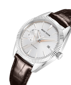 白色表盤,帶棒狀標(biāo)記。時(shí)、分、秒和日期顯示。這款奢華腕表的表盤 12 點(diǎn)鐘位置印有品牌標(biāo)識。