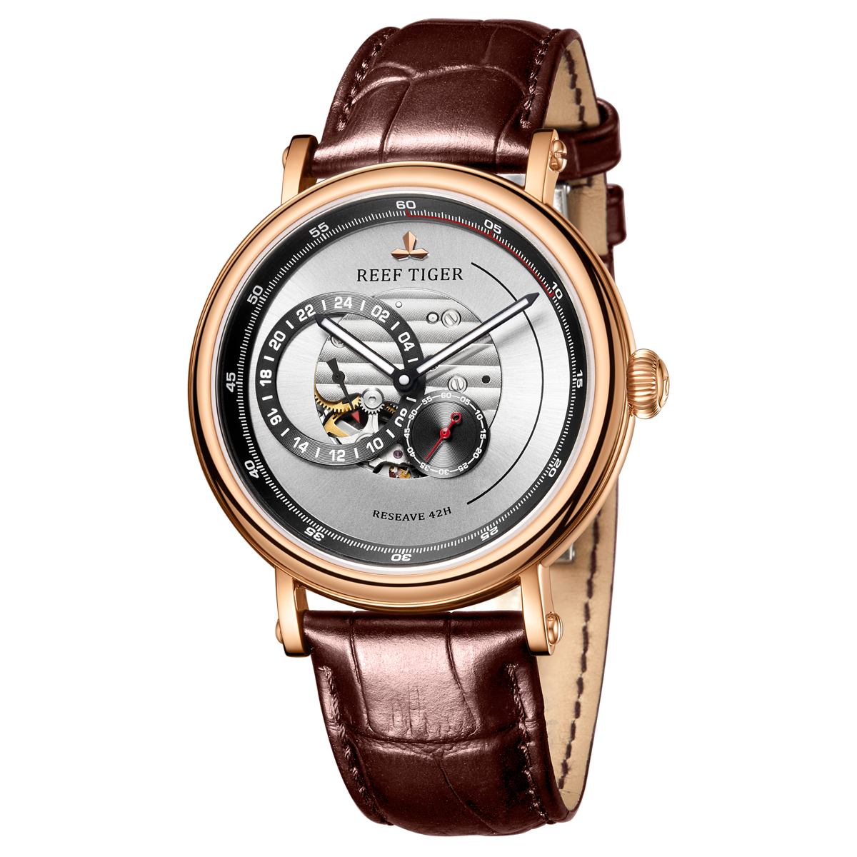 Reef Tiger Seattle Reserve 腕表。耐用的玫瑰金表圈,還配有玫瑰金表圈,打造專業(yè)的提案和演示。耐用的聚酯前后蓋,協(xié)調(diào)一致。