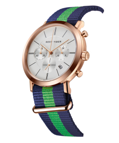 藍/綠色尼龍表帶,配以不銹鋼縫線和針扣,可在 Reef Tiger 專有表帶系統(tǒng)內互換。