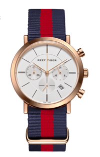 藍(lán)/紅色尼龍表帶,配有不銹鋼縫線和針扣,可在 Reef Tiger 專有表帶系統(tǒng)內(nèi)互換。