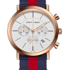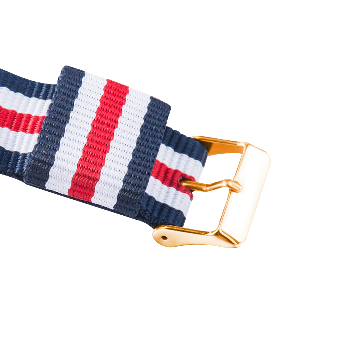藍(lán)/白/紅色尼龍表帶,配以不銹鋼縫線和針扣,可在 Reef Tiger 專有表帶系統(tǒng)內(nèi)互換。
