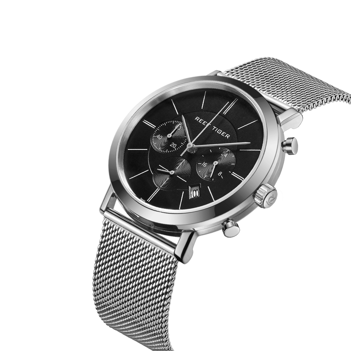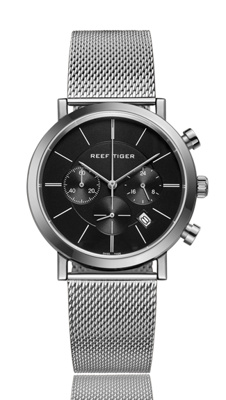 不銹鋼表帶搭配不銹鋼縫線和針扣,可在 Reef Tiger 專有表帶系統(tǒng)內(nèi)互換。