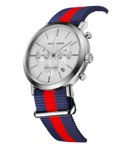 藍(lán)/紅色尼龍表帶,配有不銹鋼縫線和針扣,可在 Reef Tiger 專有表帶系統(tǒng)內(nèi)互換。