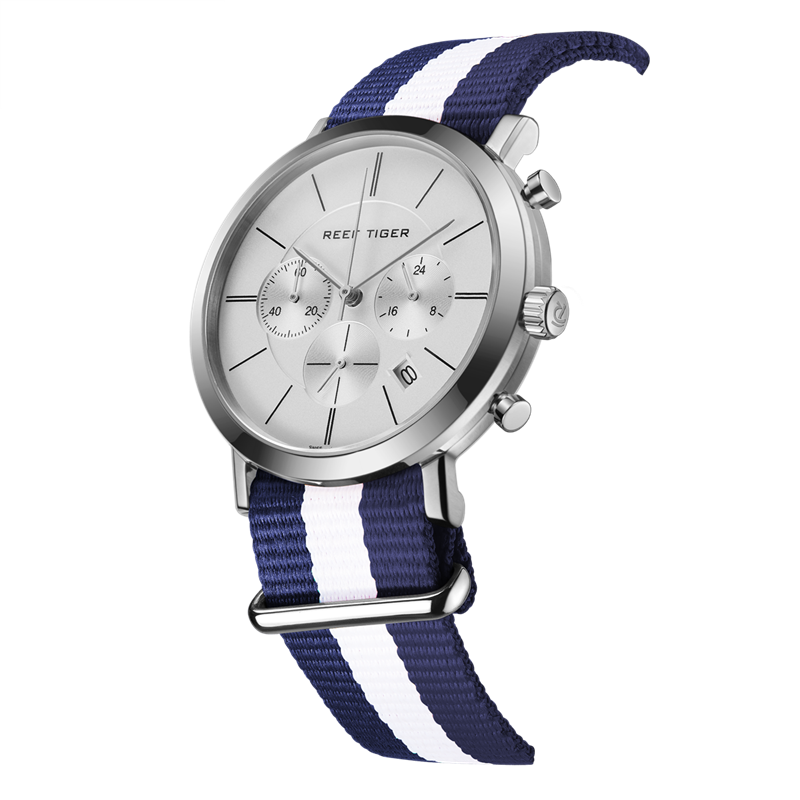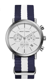 藍/白色尼龍表帶,配有不銹鋼縫線和針扣,可在 Reef Tiger 專有表帶系統(tǒng)內互換。