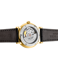 香檳色表盤,帶黑色羅馬數(shù)字標(biāo)記。小時(shí)和分鐘顯示。這款時(shí)尚的男士手表在表盤 12 點(diǎn)鐘位置印有其標(biāo)志。