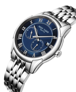 藍(lán)色表盤(pán),帶羅馬數(shù)字標(biāo)記。時(shí)、分、秒和日期顯示。這款時(shí)尚的男士手表在表盤(pán) 12 點(diǎn)鐘位置印有其標(biāo)志。
