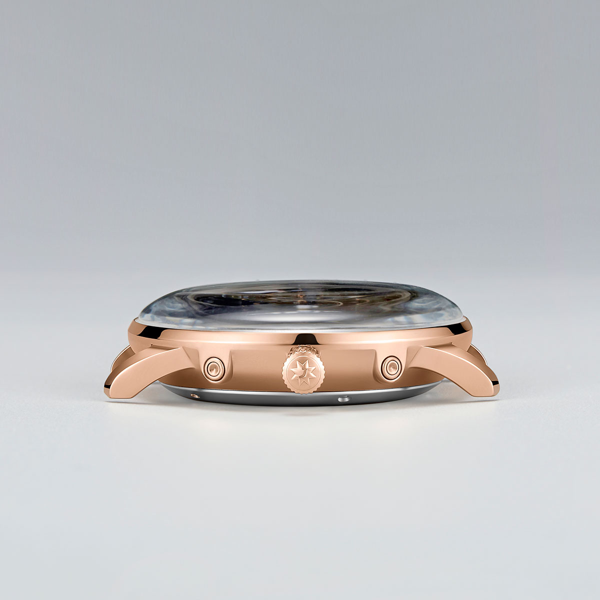 黑色表盤搭配玫瑰金色棒狀標記。時、分、秒、星期、日期和月相顯示。這款奢華腕表的表盤 3 點鐘位置印有品牌標識。