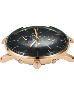 黑色表盤(pán)搭配玫瑰金色棒狀標(biāo)記。時(shí)、分、秒、星期、日期和月相顯示。這款奢華腕表的表盤(pán) 3 點(diǎn)鐘位置印有品牌標(biāo)識(shí)。