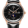 黑色表盤搭配玫瑰金色棒狀標記。時、分、秒、星期、日期和月相顯示。這款奢華腕表的表盤 3 點鐘位置印有品牌標識。