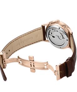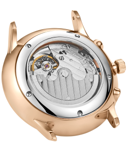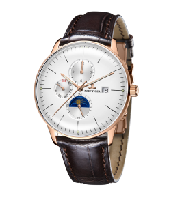 白色表盤,帶玫瑰金色棒狀標(biāo)記。時(shí)、分、秒、星期、日期和月相顯示。這款奢華腕表的表盤 3 點(diǎn)鐘位置印有品牌標(biāo)識。