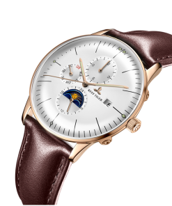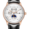 白色表盤,帶玫瑰金色棒狀標(biāo)記。時、分、秒、星期、日期和月相顯示。這款奢華腕表的表盤 3 點鐘位置印有品牌標(biāo)識。