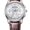 銀色表盤,帶棒狀/阿拉伯?dāng)?shù)字標(biāo)記。計(jì)時(shí)碼表、小時(shí)、分鐘、秒和日期顯示。這款奢華腕表的表盤 12 點(diǎn)鐘位置印有品牌標(biāo)識(shí)。
