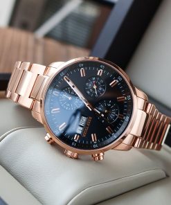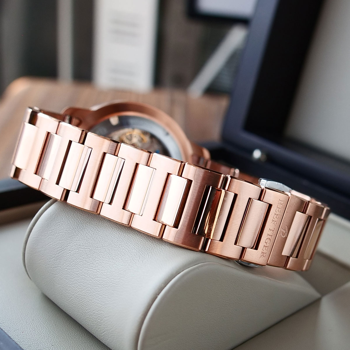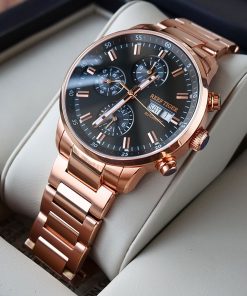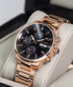 黑色表盤,帶銀色棒狀標(biāo)記。小時、分鐘、秒、星期、日期 這款奢華腕表的表盤 3 點鐘位置印有品牌標(biāo)識。