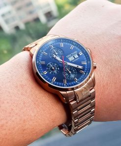 藍色表盤,帶銀色棒狀標(biāo)記。小時、分鐘、秒、星期、日期 這款奢華腕表的表盤 3 點鐘位置印有品牌標(biāo)識。