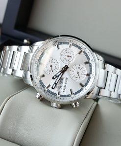 白色表盤,帶銀色棒狀標(biāo)記。小時、分鐘、秒、星期、日期 這款奢華腕表的表盤 3 點(diǎn)鐘位置印有品牌標(biāo)識。