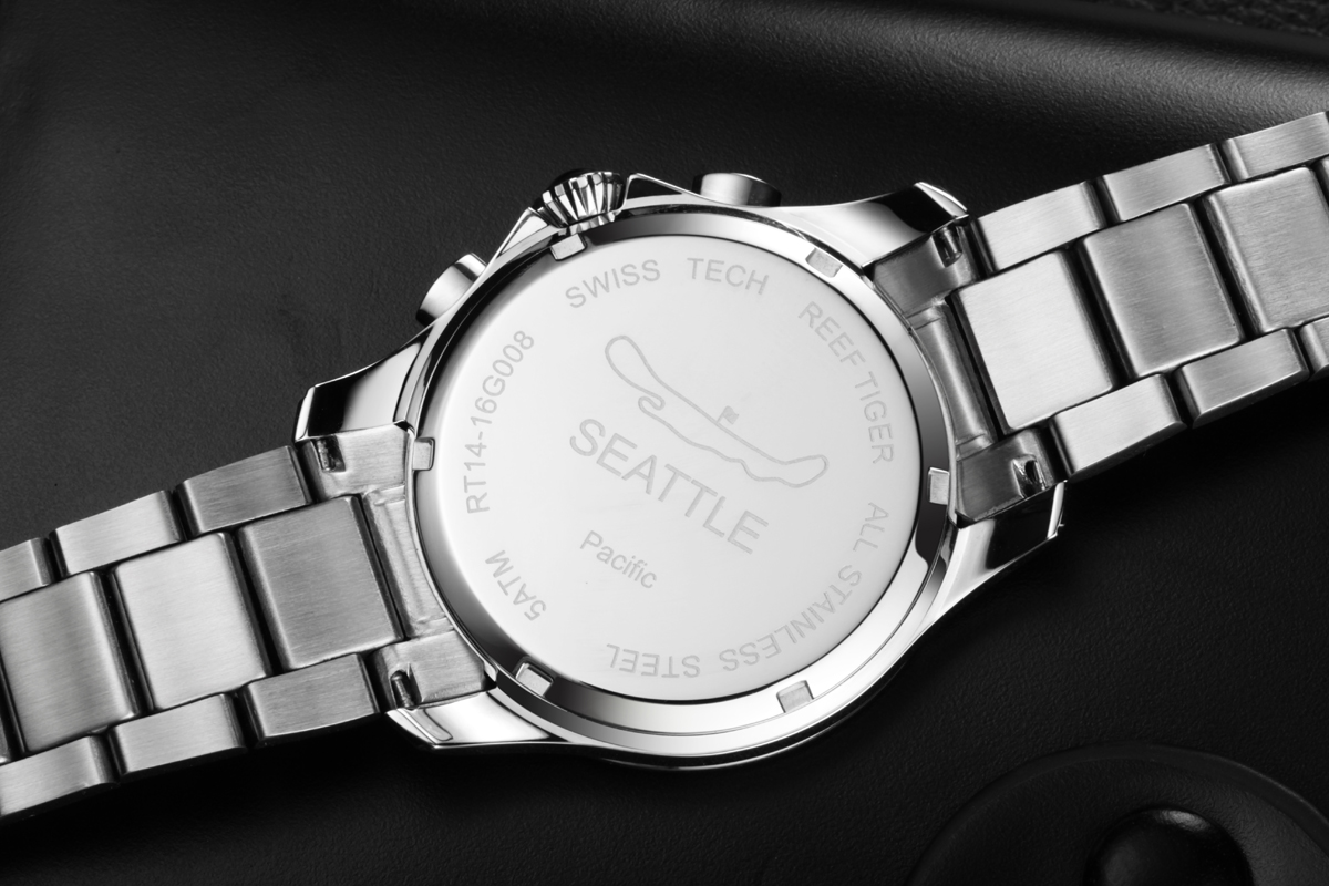 西雅圖太平洋計時手表。耐用的不銹鋼固定表圈還配有專業(yè)外觀的提案和演示。耐用的聚酯前后蓋,協調一致。
