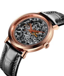 鏤空表盤鑲嵌鉆石。小時和分鐘顯示。這款時尚的男士手表在表盤 12 點鐘位置印有其標志。