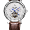 白色表盤帶點(diǎn)/阿拉伯?dāng)?shù)字標(biāo)記。時(shí)、分、秒、年和月顯示。這款豪華手表在表盤 12 點(diǎn)鐘位置有其標(biāo)志。
