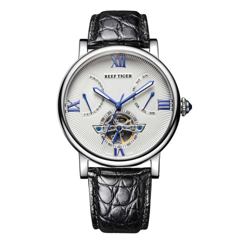 水波紋白色表盤(pán),羅馬數(shù)字時(shí)標(biāo),搭配飛輪、星期和日期顯示,映射成熟智慧。