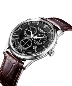 黑色表盤,帶棒狀標(biāo)記。日期指示器顯示在表盤的 10 點(diǎn)鐘位置。可以使用購買的腕表的免費(fèi)工具調(diào)整日期。當(dāng)腕表上弦時(shí),動(dòng)力儲(chǔ)存至少可達(dá)到 40 小時(shí)。RT7151 自動(dòng)機(jī)芯的動(dòng)力儲(chǔ)存約為 48 小時(shí)。24 小時(shí)指示,指針顯示在 2 點(diǎn)鐘位置。您可以按下表殼上 2:00 處的按鈕進(jìn)行調(diào)整。但請(qǐng)不要在晚上 8:30 至次日凌晨 3:30 之間調(diào)整,因?yàn)樵诖似陂g星期功能正在更改。月份指示子表盤顯示在 6 點(diǎn)鐘位置。此外,此子表盤下方還顯示世界時(shí)間指示器。Reef Tiger Geographer 系列手表提供兩種款式可供選擇,包括不銹鋼款和玫瑰金款。