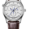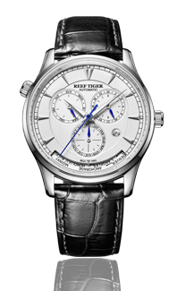 白色表盤,帶棒狀標(biāo)記。日期指示器顯示在表盤的 10 點鐘位置??梢允褂觅徺I的腕表的免費工具調(diào)整日期。當(dāng)腕表上弦時,動力儲存至少可達(dá)到 40 小時。RT7151 自動機芯的動力儲存約為 48 小時。24 小時指示,指針顯示在 2 點鐘位置。您可以按下表殼上 2:00 處的按鈕進行調(diào)整。但請不要在晚上 8:30 至次日凌晨 3:30 之間調(diào)整,因為在此期間星期功能正在更改。月份指示子表盤顯示在 6 點鐘位置。此外,此子表盤下方還顯示世界時間指示器。Reef Tiger Geographer 系列手表提供兩種款式可供選擇,包括不銹鋼款和玫瑰金款。