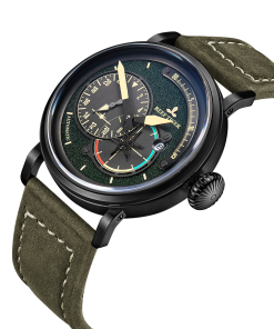 綠色表盤,配黃色棒和數(shù)字標(biāo)記。小時、分鐘和日期顯示。