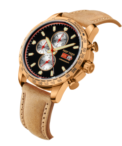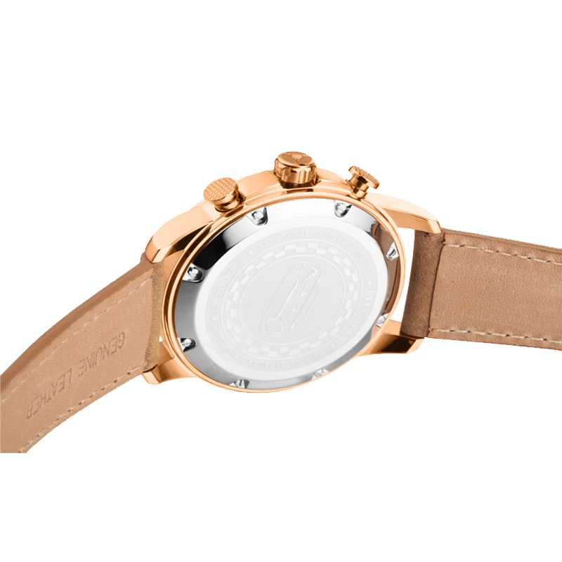 Aurora Racing Chrono 手表。耐用的不銹鋼鍍玫瑰金,固定表圈也適合打造專業(yè)的提案和演示。耐用的聚酯前后蓋,協(xié)調(diào)一致。