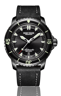 純黑色表盤,帶棒狀標記。直徑 44.5 毫米。非常優(yōu)雅和經典。作為一款商務腕表,簡單易讀是 Reef Tiger 一直追求的目標。 6點鐘位置的日期顯示窗口帶來更好的佩戴感。