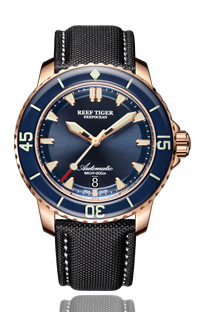 純藍(lán)色表盤,帶棒狀標(biāo)記。直徑 44.5 毫米。非常優(yōu)雅和經(jīng)典。作為一款商務(wù)腕表,簡單易讀是 Reef Tiger 一直追求的目標(biāo)。 6點(diǎn)鐘位置的日期顯示窗口帶來更好的佩戴感受。