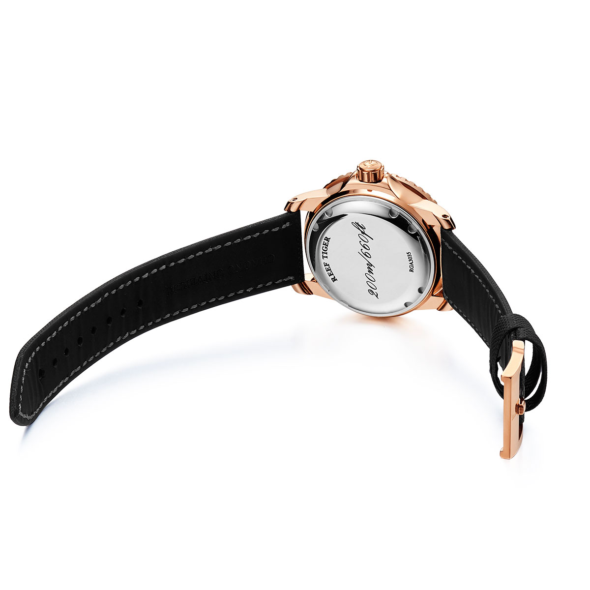 Aurora Deep Ocean 腕表。耐用的不銹鋼鍍玫瑰金,單向旋轉(zhuǎn)表圈也適合打造專業(yè)的提案和演示。耐用的聚酯前后蓋,協(xié)調(diào)一致。