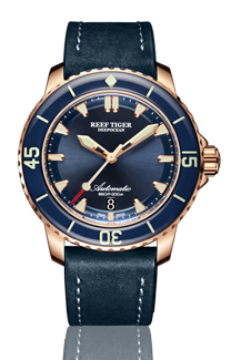 純藍(lán)色表盤,帶棒狀標(biāo)記。直徑 44.5 毫米。非常優(yōu)雅和經(jīng)典。作為一款商務(wù)腕表,簡(jiǎn)單易讀是 Reef Tiger 一直追求的目標(biāo)。 6點(diǎn)鐘位置的日期顯示窗口帶來(lái)更好的佩戴感。