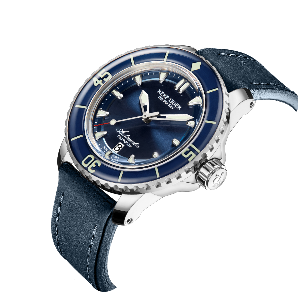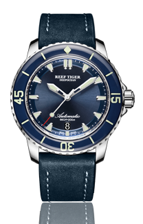 純藍色表盤帶棒狀標記。直徑 44.5 毫米。它非常優(yōu)雅和經(jīng)典。作為一款商務(wù)腕表,簡單易讀是 Reef Tiger 一直追求的目標。 6點鐘位置的日期顯示窗口帶來更好的佩戴感。