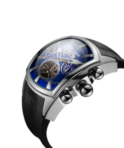 藍(lán)色表盤,帶夜光棒標(biāo)記和大型超級夜光指針。陀飛輪、小時、分鐘、秒。這手表的表盤 12 點(diǎn)鐘位置有其標(biāo)志。