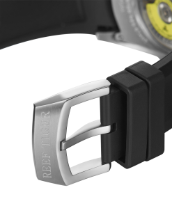 柔軟舒適的黑色橡膠表帶,配有表扣。