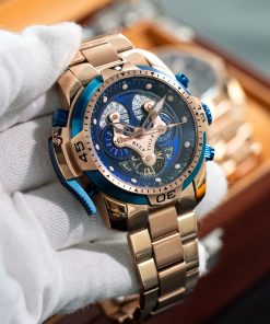 藍(lán)色表盤,帶兩個小表盤。 陀飛輪框架顯示在 6 點鐘位置,年份和月份顯示在 12:00 位置,星期顯示在 9:00 位置,日期顯示在 3:00 位置。