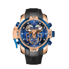 藍(lán)色表盤搭配玫瑰金蜘蛛。 12:00 處顯示年份和月份, 9 點(diǎn)顯示星期,3 點(diǎn)顯示日期。