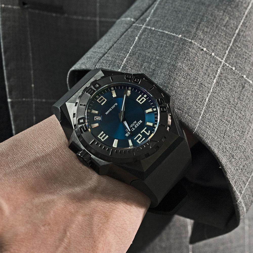Aurora Black Shark 手表。耐用、不銹鋼配 PVD,固定表圈也適合打造專業(yè)的提案和演示文稿。耐用的聚酯前后蓋,協(xié)調(diào)一致。
