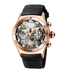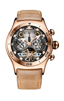 黑色鏤空表盤,帶兩個(gè)子表盤。 12 點(diǎn)鐘位置有兩個(gè)年份和月份窗口。陀飛輪顯示位于 6 點(diǎn)鐘位置,星期顯示位于 3 點(diǎn)鐘位置,日期顯示位于 9 點(diǎn)鐘位置。