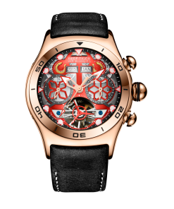 紅色鏤空表盤,帶兩個子表盤。 12 點鐘位置有兩個年份和月份窗口。陀飛輪顯示位于 6 點鐘位置,星期顯示位于 3 點鐘位置,日期顯示位于 9 點鐘位置。