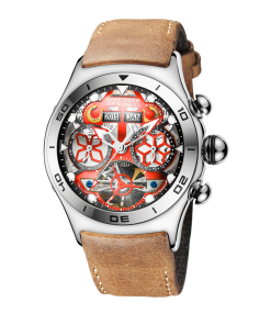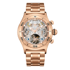 鏤空表盤(pán)配有兩個(gè)子表盤(pán)。 12 點(diǎn)鐘位置有兩個(gè)年份和月份窗口。陀飛輪顯示位于 6 點(diǎn)鐘位置,星期顯示位于 3 點(diǎn)鐘位置,日期顯示位于 9 點(diǎn)鐘位置。